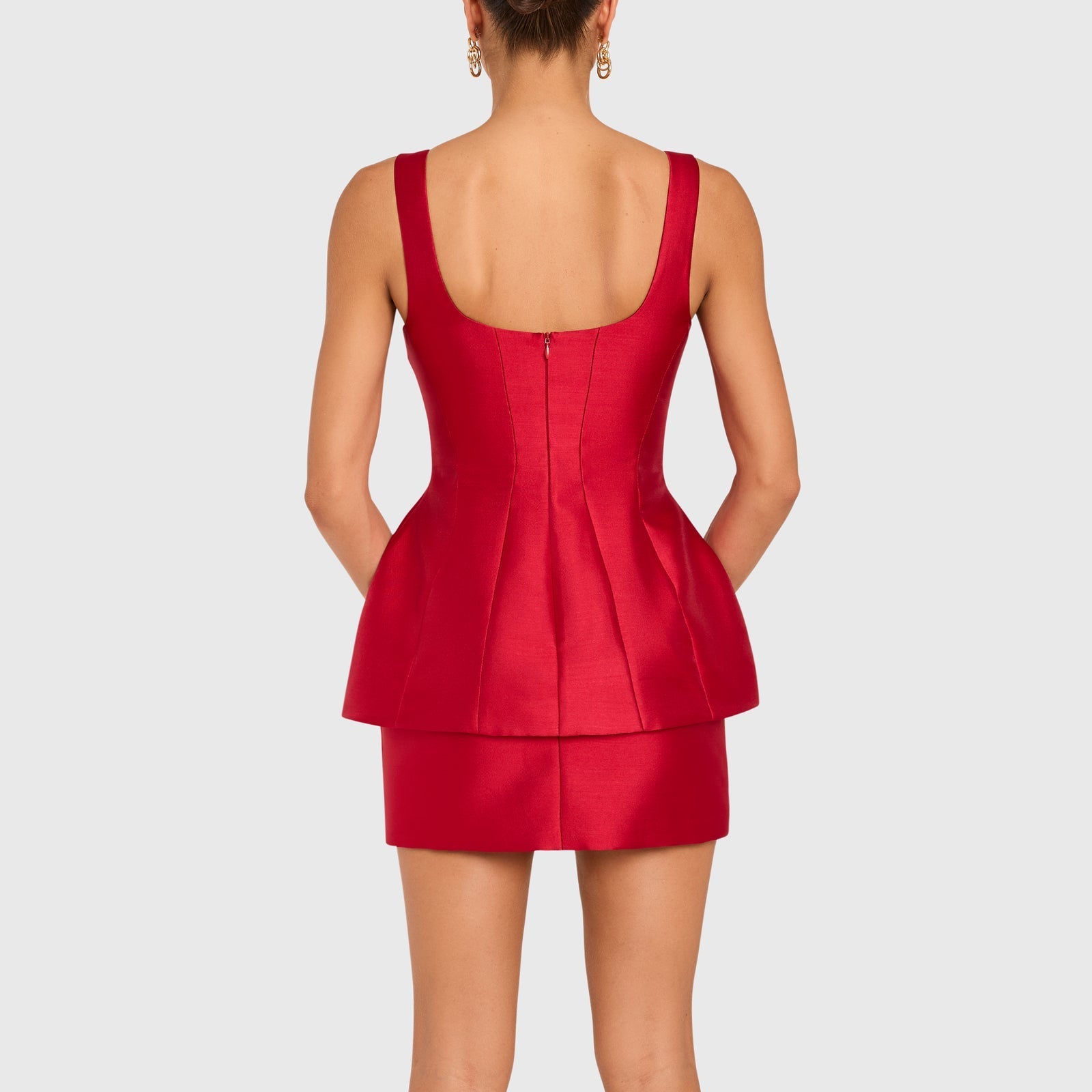 Stun in the Empire Dress. Featuring a deep scoop neck, corset-style seams, and a peplum waist, this dress is beyond flattering. Pair with kitten heels and your favorite clutch, and you’re ready for a fun night out.