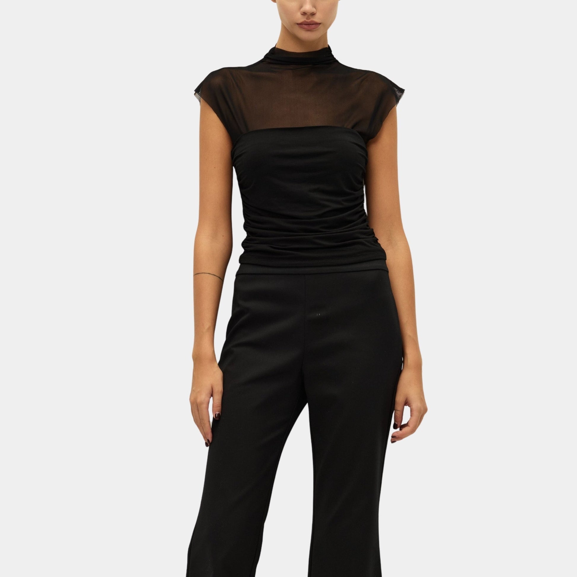 The Lana Top in black features a sheer mesh panel at the neckline and shoulders for a modern touch. Its fitted shape flatters your silhouette, making it easy to style with jeans, trousers, or skirts for any occasion.